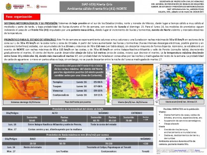 Prensa /Protección Civil - Este fin de semana se espera ambiente caluroso a muy caluroso y una Surada con rachas máximas de 50 a 65 km/h en sectores de la zona sur y de 30 a 45 km/h en la costa norte y zona de Orizaba.