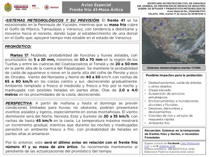| Martes 17: Nublado, probabilidad de lloviznas y lluvias aisladas, con acumulados de 5 a 20 mm, máxim... |